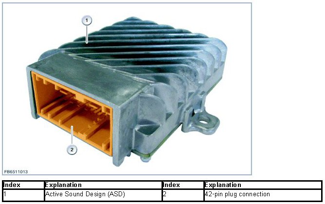 During the service life of the vehicle, various repairs may become necessary. In the course of repairs, components for various software versions and hardware numbers may be installed. The control unit for Active Sound Design (ASD) can be replaced individually. The control unit for Active Sound Design (ASD) must always be encoded after replacement.