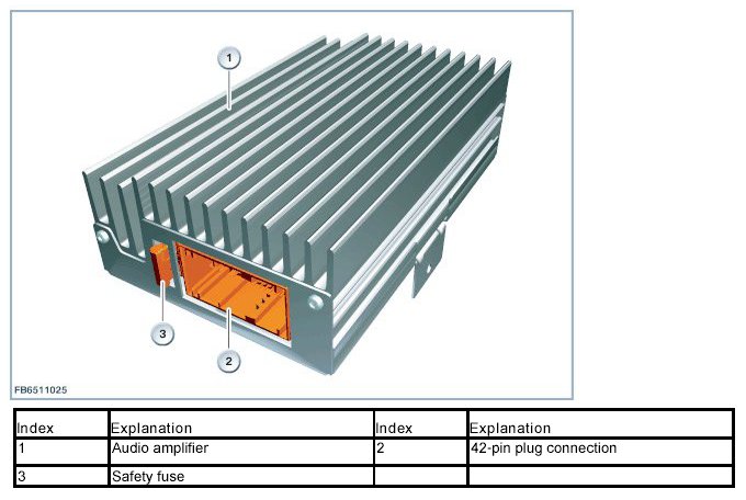 The audio amplifier (AMPH) is an amplifier with digital equalizing. The audio signals are transferred from the headunit to the audio amplifier (AMPH) in analogue form. The internal digital equalizing adjusts the audio signals to the particular vehicle by means of coding. The audio amplifier (AMPH) is an amplifier with active frequency diplexers. Active frequency diplexers achieve better acoustic results than passive frequency diplexers. The modified and amplified audio signals are transmitted to the relevant speakers.