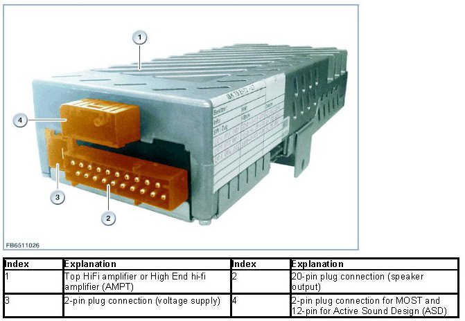 The digital Top HiFi amplifier and the High End HiFi amplifier (AMPT) convert the digital audio signals transmitted from the headunit to the MOST bus into analogue audio signals. The Top HiFi amplifier and High End hi-fi amplifier (AMPT) also receive the analogue signals from the Active Sound Design (ASD). The combined and amplified audio signals are transmitted to the relevant speakers.