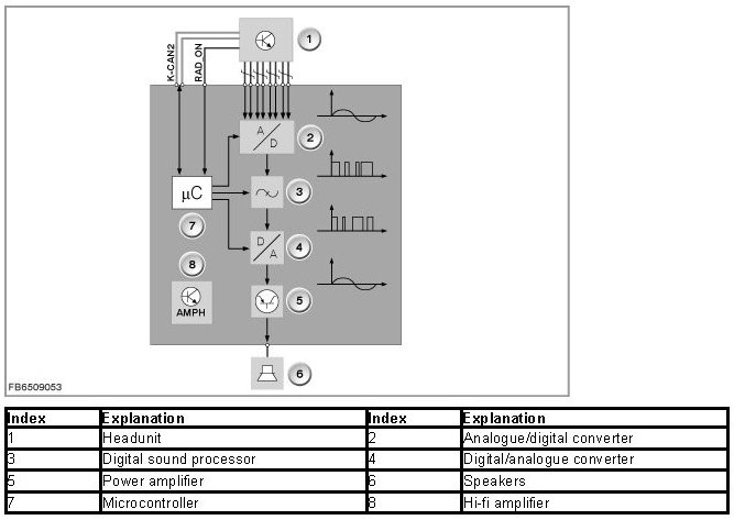The hi-fi amplifier can be coded and programmed. After the hi-fi amplifier is replaced, the new amplifier must be programmed and coded. From September 2010 a bus connection will no longer be installed for the hi-fi amplifier.