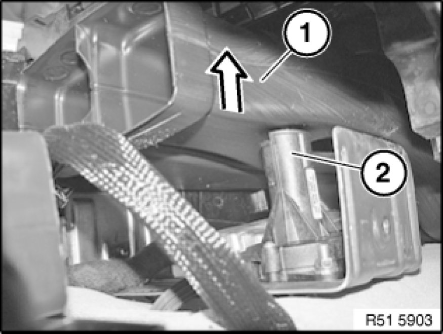 Lift rear cabin heating duct (1) over transmission emergency release (2).