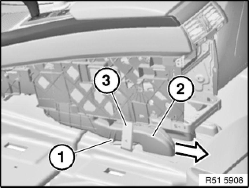 Raise center console (1) at front and feed out heating duct (2) towards top.
