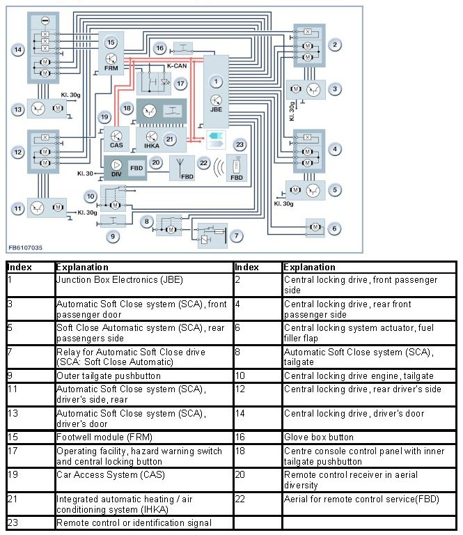 The footwell module evaluates the status of the door contacts. When the vehicle is locked or unlocked with the mechanical key element, the footwell module will recognizee this request. The footwell module transmits a message on the K-CAN to the CAS control unit.