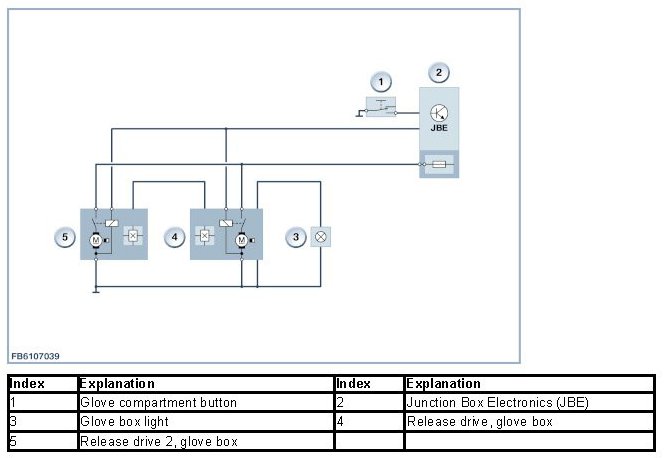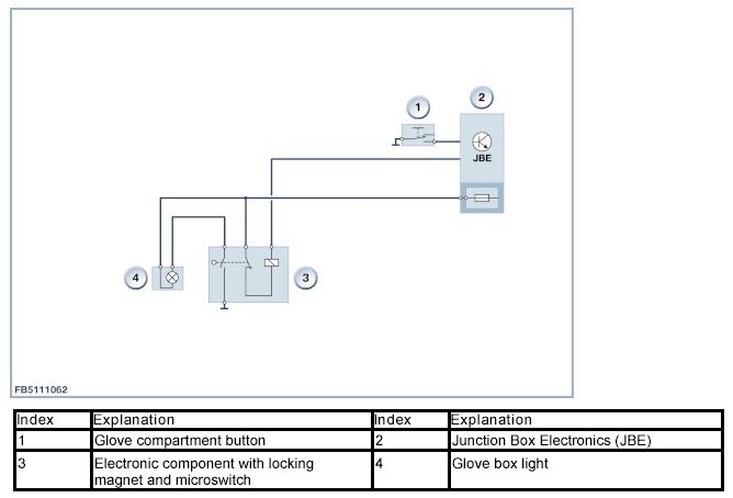 The glove compartment button is connected via a direct line connection to the junction box electronics (JBE). The junction box electronics evaluate the button signal. The junction box electronics activates the unlocking and thus the opening of the tailgate.