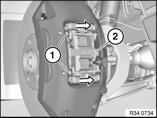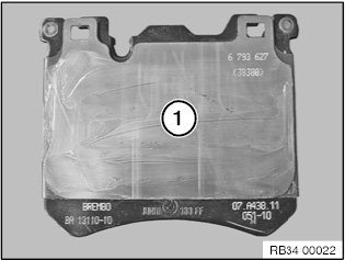 Rear side of brake pads (1) must be thinly coated with NEVER-SEEZ compound (see Electronic Parts Catalogue).