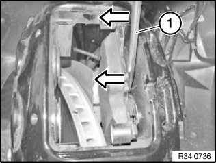 Pry brake pad (1) off brake pistons with a screwdriver in direction of arrow.