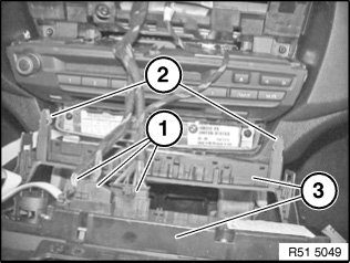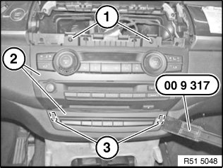 Disconnect plug connections (1) and remove centre instrument panel trim (3).