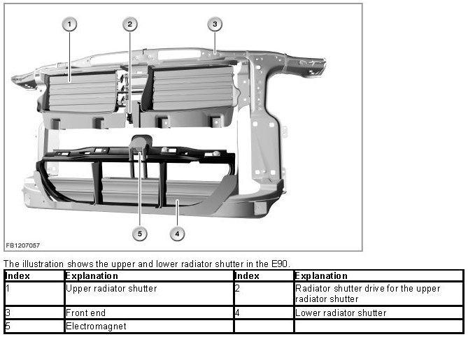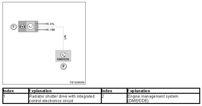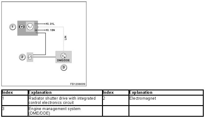 The radiator shutter drive is activated via the LIN bus by the engine management system (DME or DDE). The radiator shutter drive and electromagnet are supplied with voltage via terminal 15N.