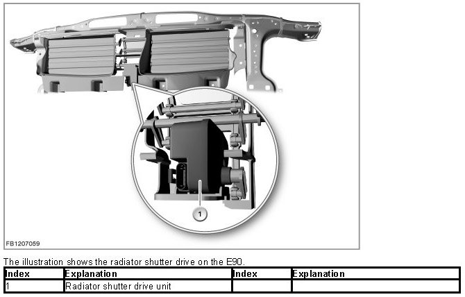 The radiator shutter drive is activated via the LIN bus by the engine management system. The radiator shutter drive is supplied with voltage via terminal 15N.