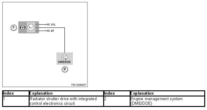 The radiator shutter drive is activated via a pulse-width modulated signal (PWM signal) from the engine management system (DME or DDE). The radiator shutter drive is supplied with voltage via terminal 87.