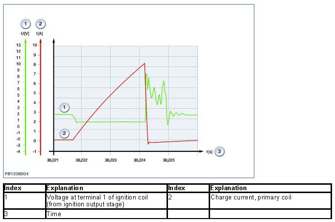 The ignition circuit is monitored on the basis of the current in the primary coil of the ignition coil. When the engine is switched on, the current must stay within specific values during certain time thresholds. The ignition diagnosis monitors the: