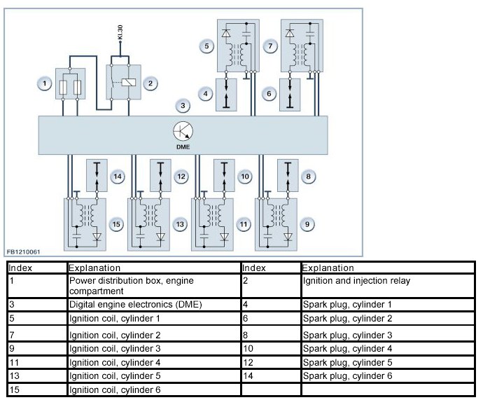 Each spark plug is activated by high voltage from a separate ignition coil (pencil ignition coil) and also a separate ignition output stage in the Digital Motor Electronics (DME).