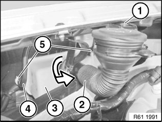 If necessary, release vent line (4) at mounting points (5) from fluid reservoir for windscreen washer unit (3).