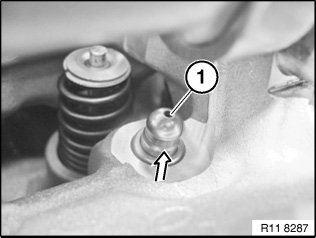 Remove hydraulic valve clearance compensating element (1) on intake side in direction of arrow.