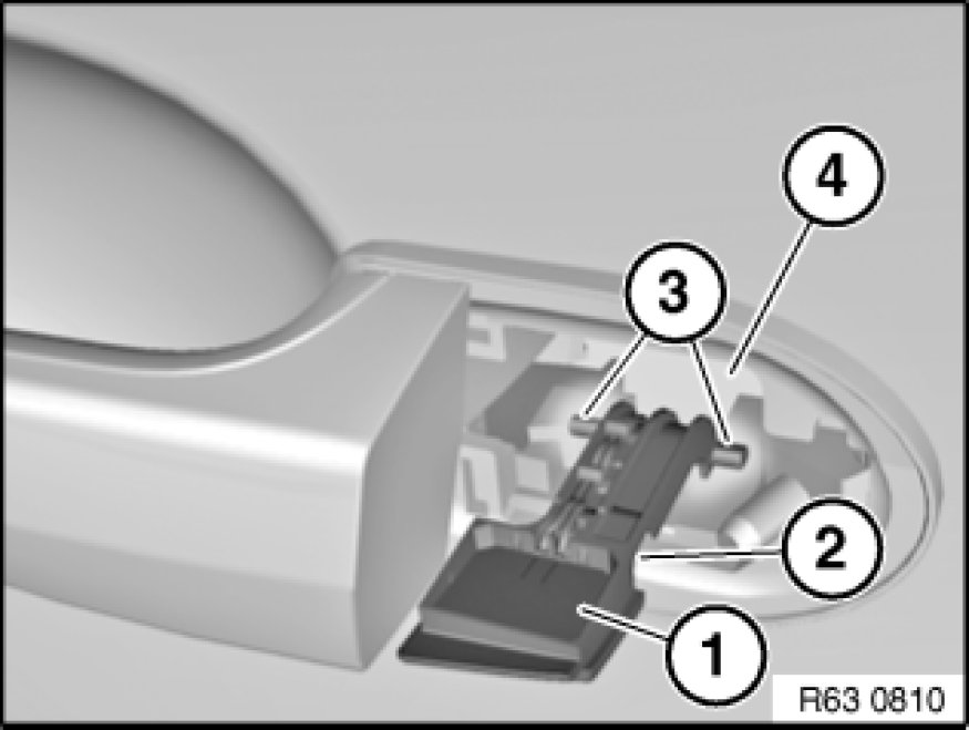 - Remove cover on outside handle 51 21 180 Removing and Installing/Replacing Cover on Outside Door Handle