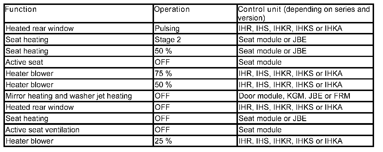 In order to avoid excessive power consumption when the engine is stopped, on these vehicles the seat heating, mirror heating, washer jet heating and heated rear window are switched off and the blower power consumption reduced to 75 %. The displays remain activated (LEDs still light up).