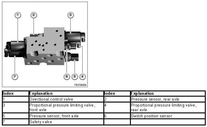 The safety valve is located in the valve block. The safety valve is electrically activated and when de-energized shuts off the hydraulic motor of the front axle.