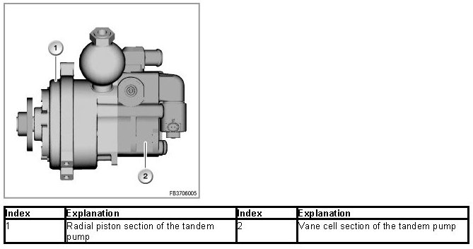 The tandem pump supplies the oil circuit of the Dynamic Drive as well as the power steering. The pump consists of a radial piston for the Dynamic Drive system and a vane pump for the power steering. Dynamic Drive and the power steering share a common oil cooler and oil reservoir.