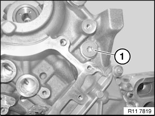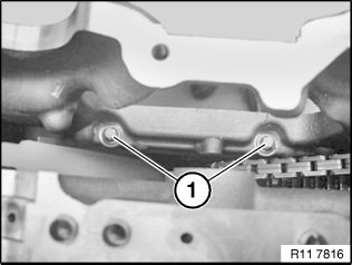 Install and tighten down bolts (1) between cylinder head and timing case cover.