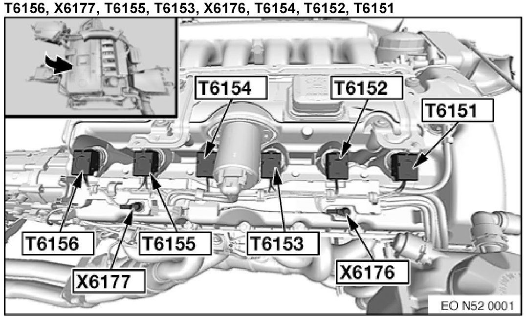 T6156, X6177, T6155, T6153, X6176, T6154, T6152, T6151 (N52 Engine or N51 Engine)