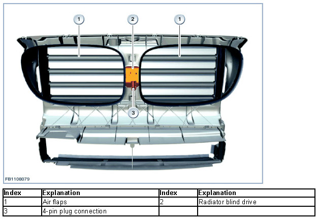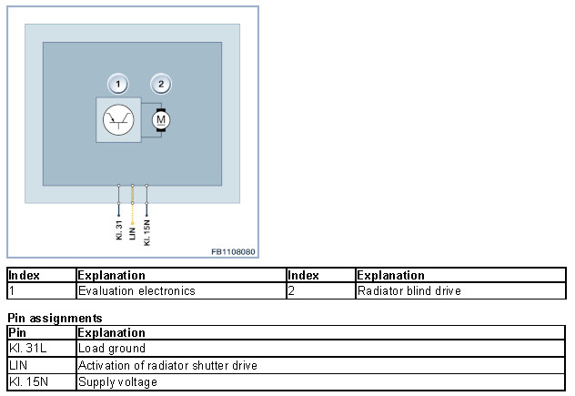 The radiator blind drive is a direct current motor. The engine control system is connected via LIN bus (Local Interconnect Network bus) to the radiator blind drive.