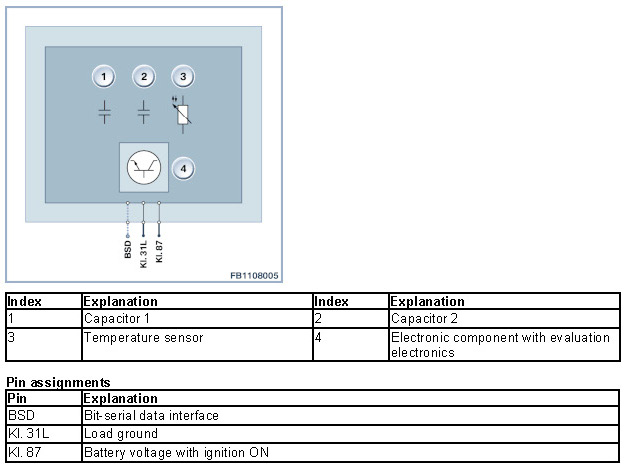 The oil condition sensor consists of 2 cylindrical condensers. The condensers are mounted above one another. 2 metal tubes are inserted one into the other to serve as electrodes. The engine oil is used as a dielectric medium between the electrodes.