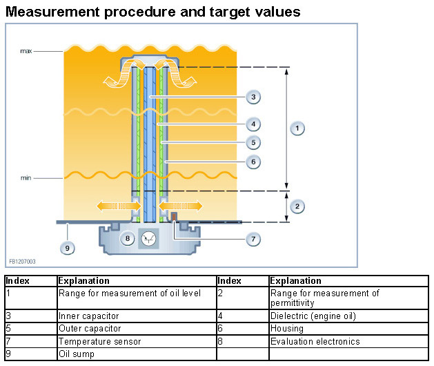 The oil level is measured for the electronic oil level check. The 2nd capacitor in the upper part of the oil condition sensor registers the oil level with the engine running. The capacitor is at the same level as the oil level in the oil sump. As the oil level changes, the capacitance of the capacitor changes. The electronic evaluation unit creates a digital signal from this. The engine-management system employs this as the basis for calculating the engine's oil level. The electronic oil level check is displayed on the Central Information Display (CID) as well as in the instrument panel. On vehicles without a CID Central Information Display the oil level is only shown in the instrument cluster.
