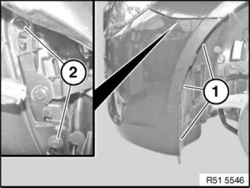 Release bolt (1) on wheel arch panel. Tilt wheel arch panel sideways.