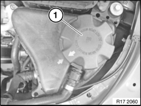 Close the sealing cap (1) of the expansion tank (2) to the point where the arrows align.