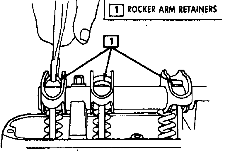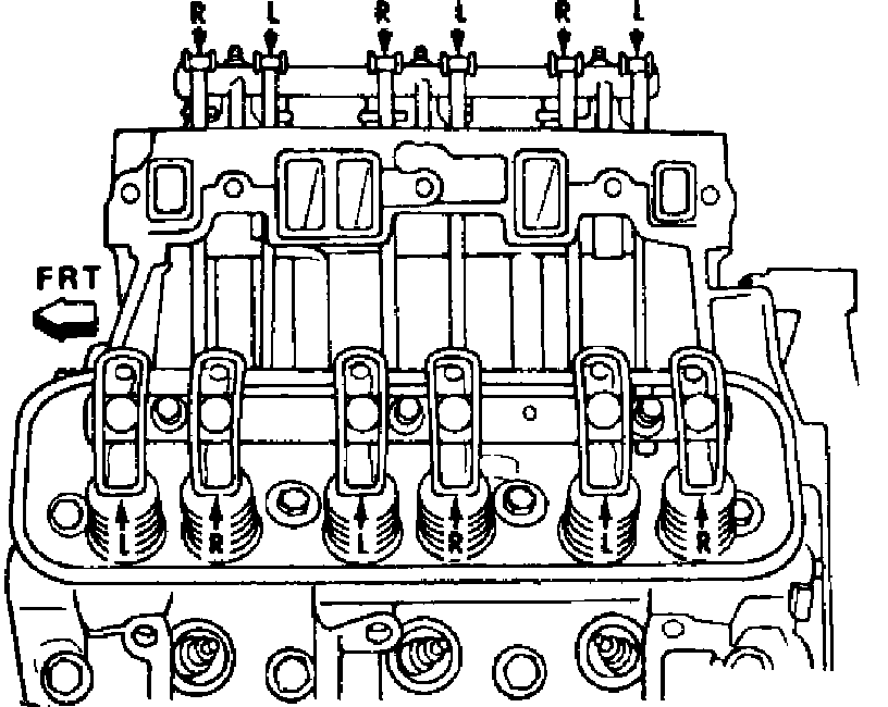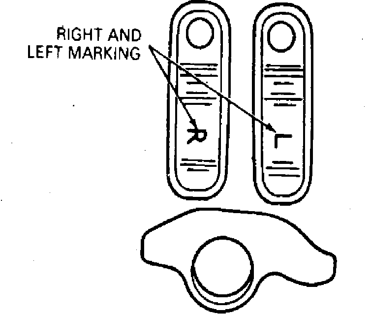 A nylon retainer is used to retain the rocker arm. Break them below their heads with a chisel or pry out with channel lock pliers, Fig. 7. Production rocker arms can be installed in any sequence since the rocker arms are identical. Replacement rocker arms are identified with a stamping indicating right (R) or left (L), Fig. 8, and must be installed as shown in Fig. 9. To install, position rocker arm on shaft and center over 1/4 inch hole in shaft. Install new rocker arm retainers using a 1/2 inch drift. Torque rocker shaft bolts to 25 ft. lbs.