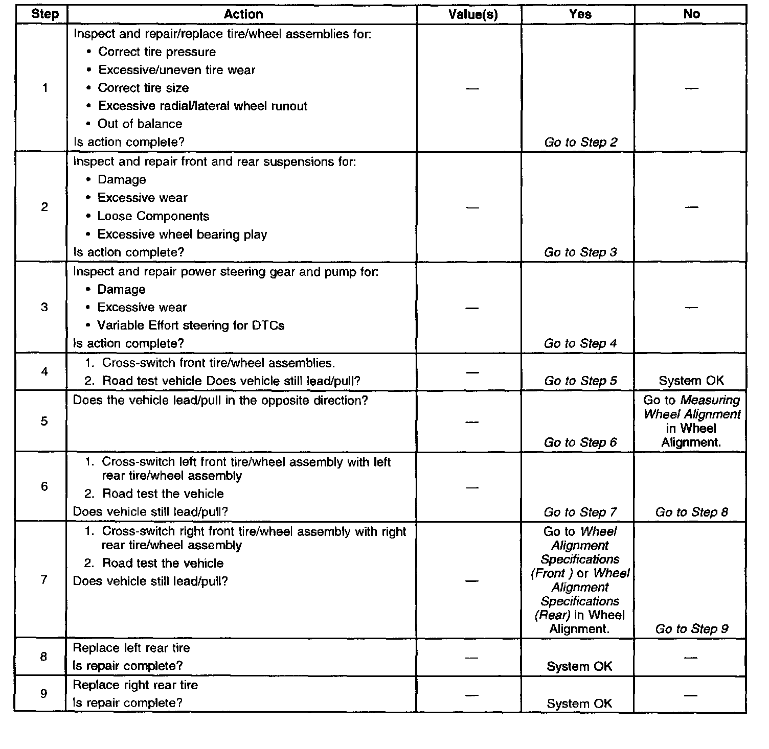 Use the lead/pull correction table in order to verify that improper tire and wheel alignment is not mistaken for tire lead.