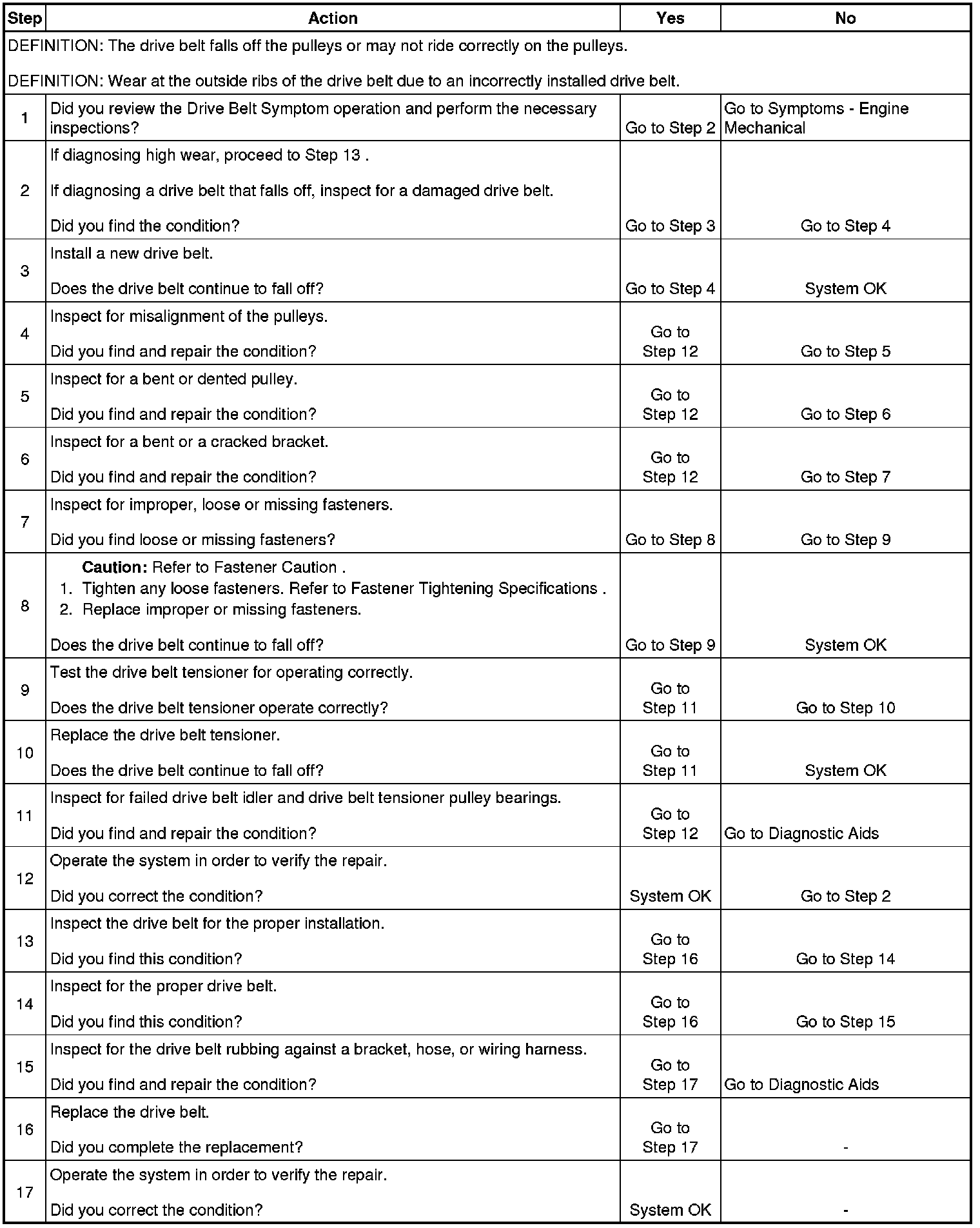 An extra load that is quickly applied on released by an accessory drive component may cause the drive belt to fall off the pulleys. Verify the accessory drive components operate properly.