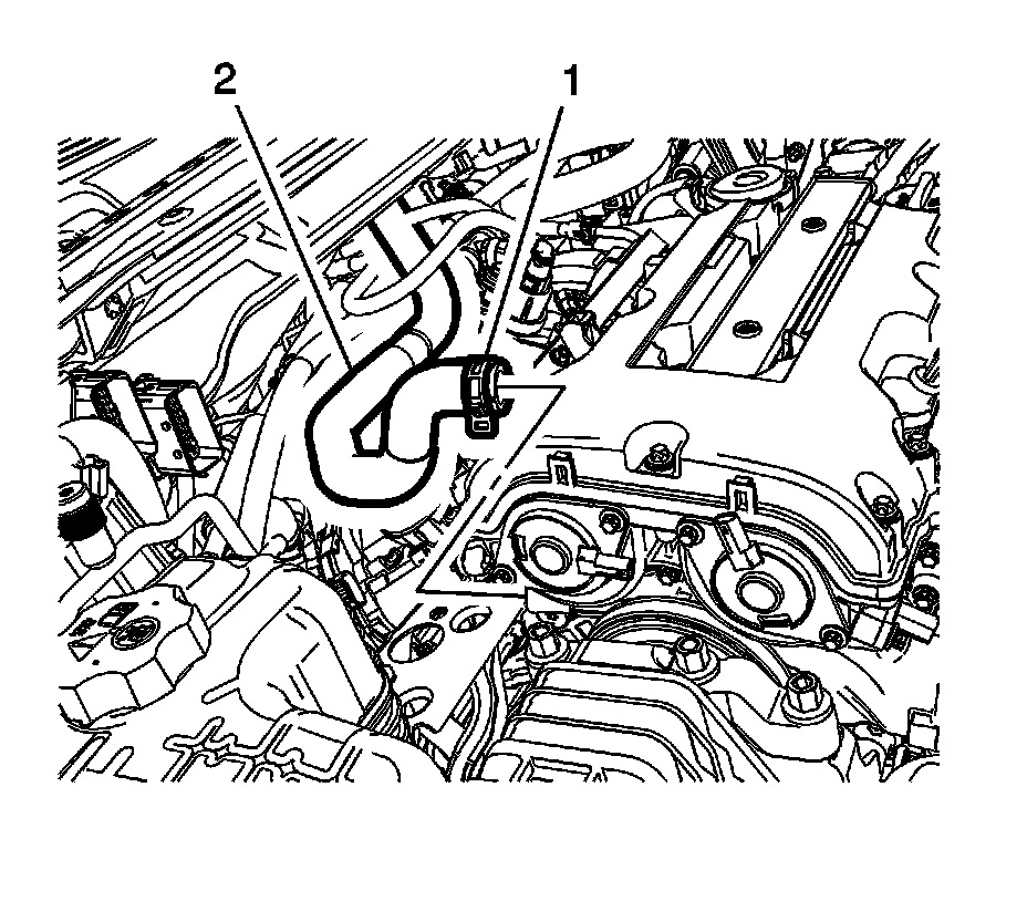 6. Remove the heater water shutoff valve inlet hose (2) from engine.