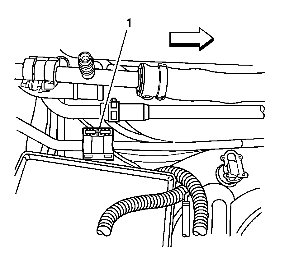 3. Disconnect and remove the A/C tube connector (1) at the evaporator rear line assembly. Refer to Air Conditioning Line/Tube Connector Removal/Replacement Air Conditioning Line/Tube Connector Removal/Replacement.