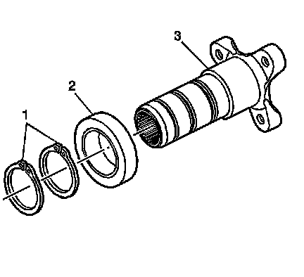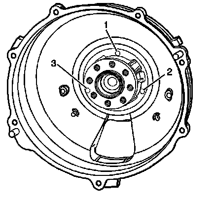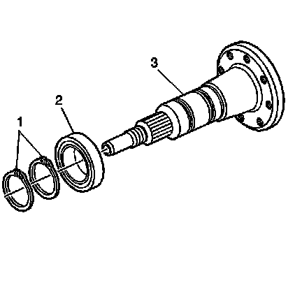 6. Remove the snap rings (1) and bearing (2) from the flex plate spindle (3).