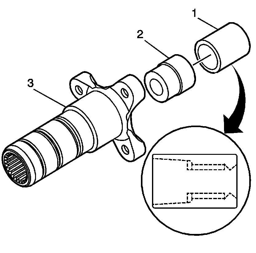 6. Remove the propeller shaft bushing (1) and transmission input shaft bushing (2) from the hub (3) - manual transmission.