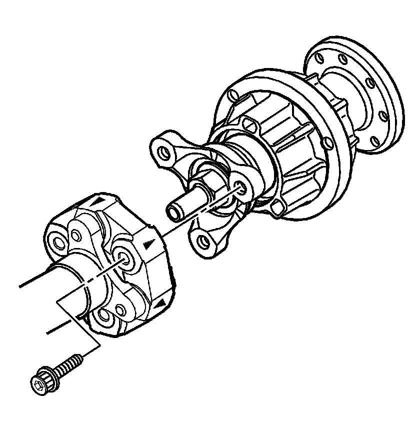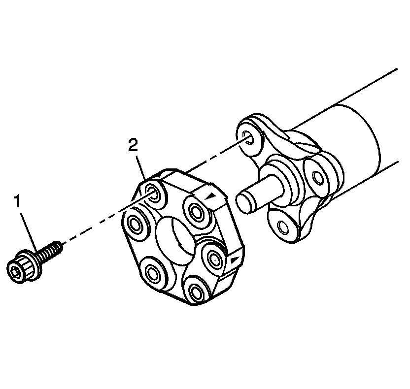 16. Remove the front coupling (2), bolts (1), and washers from the propeller shaft.