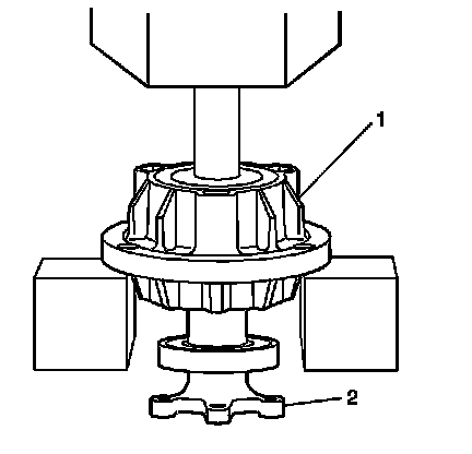 3. Position the bearing housing assembly (1) into a press in order to remove the hub and bearing assembly (2).