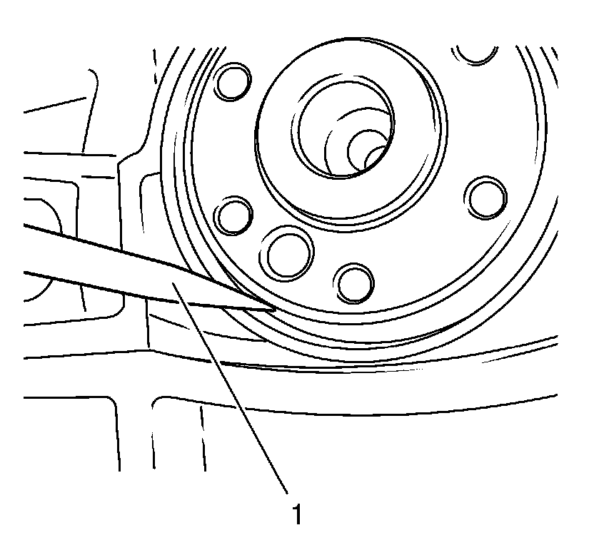 6. Using a suitable tool, such as a scribe (1), make a hole in the crankshaft rear oil seal.