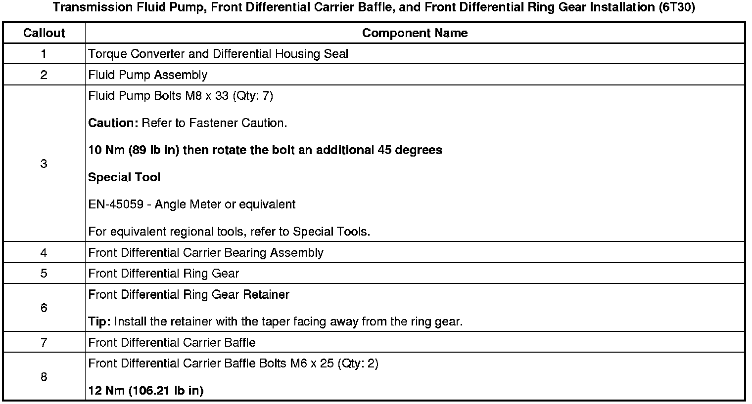 Transmission Fluid Pump, Front Differential Carrier Baffle, and Front Differential Ring Gear Installation (6T30)