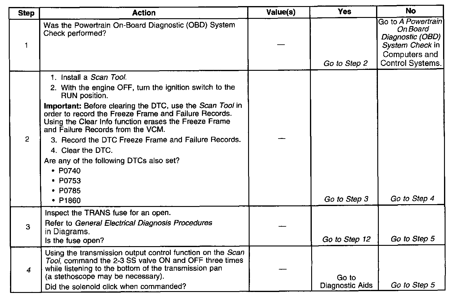The numbers below refer to the step numbers on the diagnostic table.