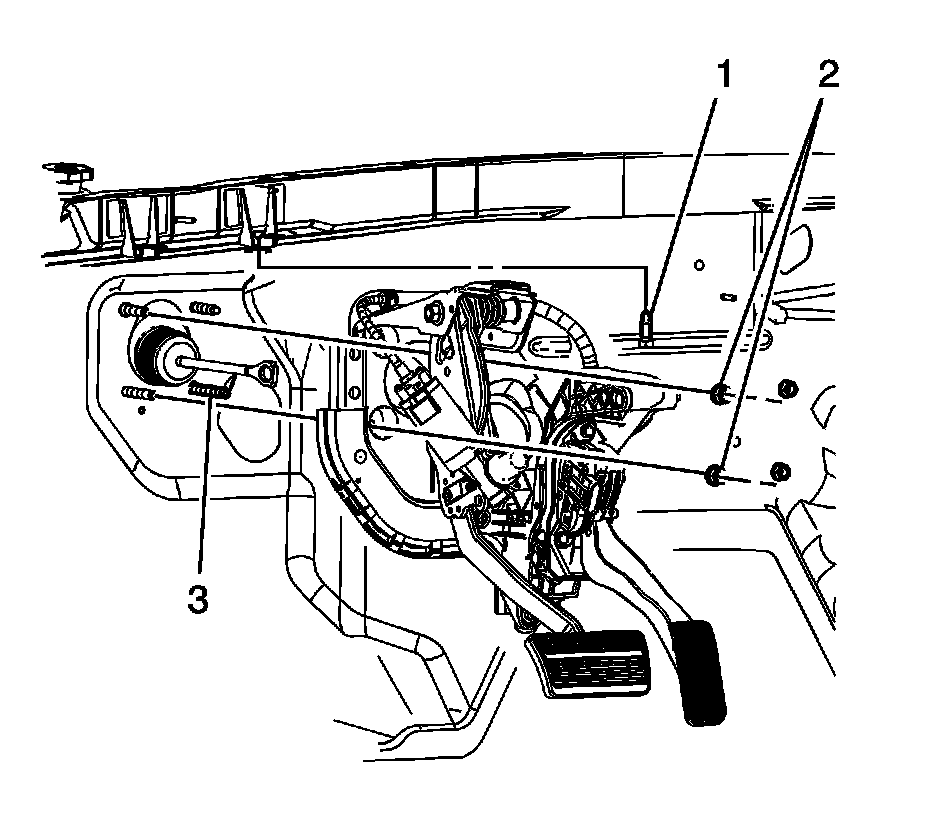 10. Remove the electronic adjustable pedal (EAP) bracket nuts (2) from the brake booster studs (3).