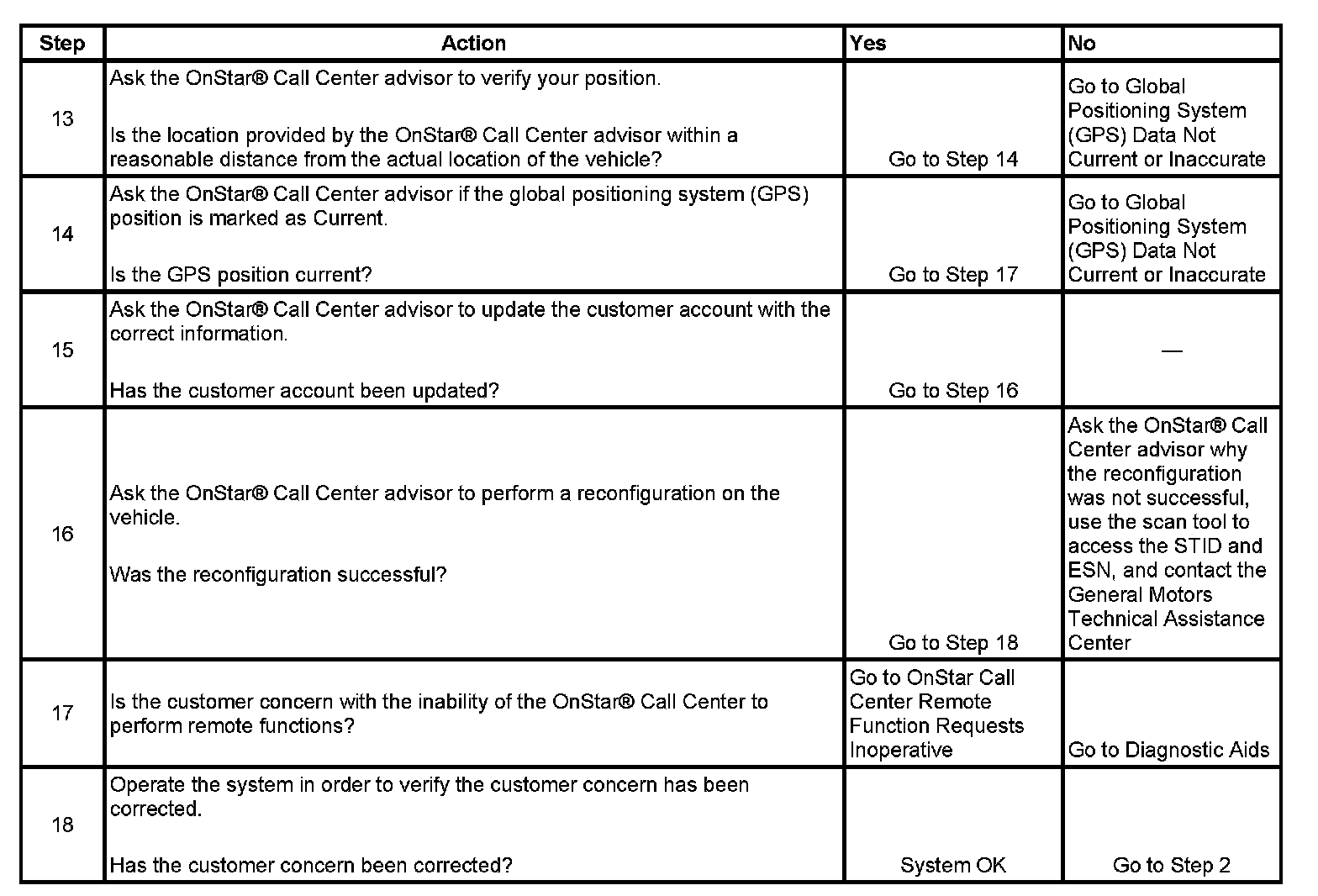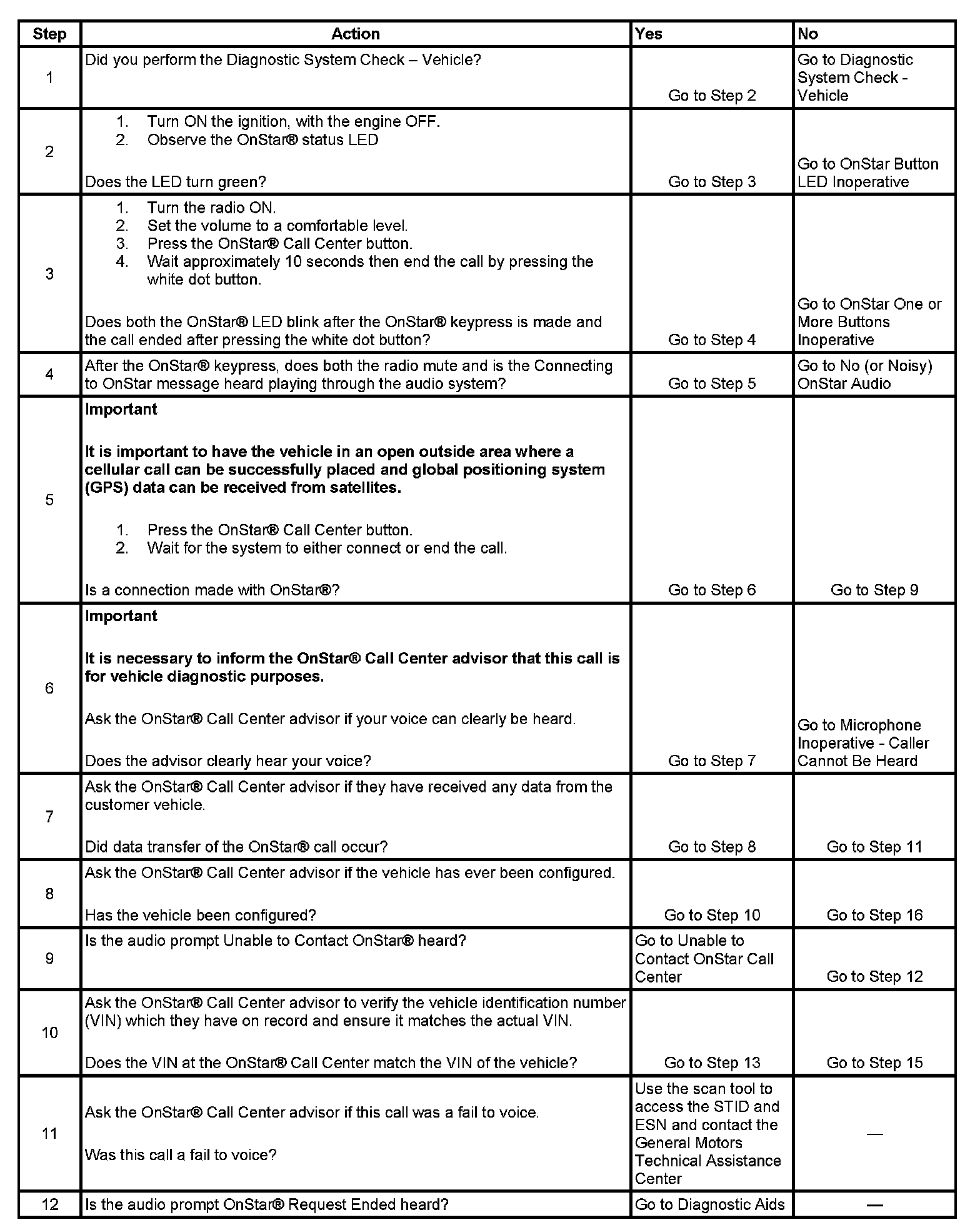 This symptom table will enable the user to verify the customer complaint and narrow it to its source. If there is a concern with voice recognition or OnStar(R) steering wheel control function, technicians should proceed directly to the applicable diagnostic.