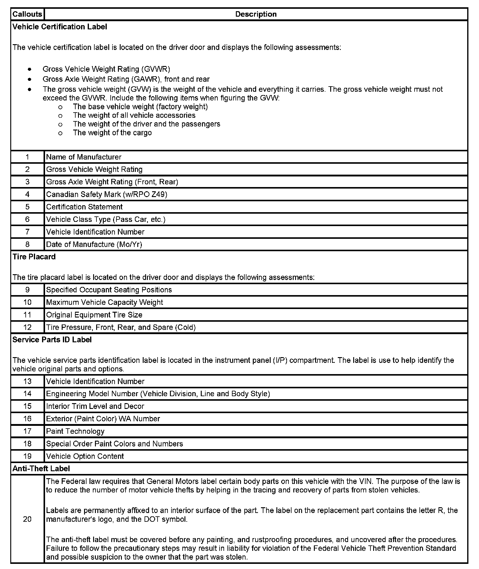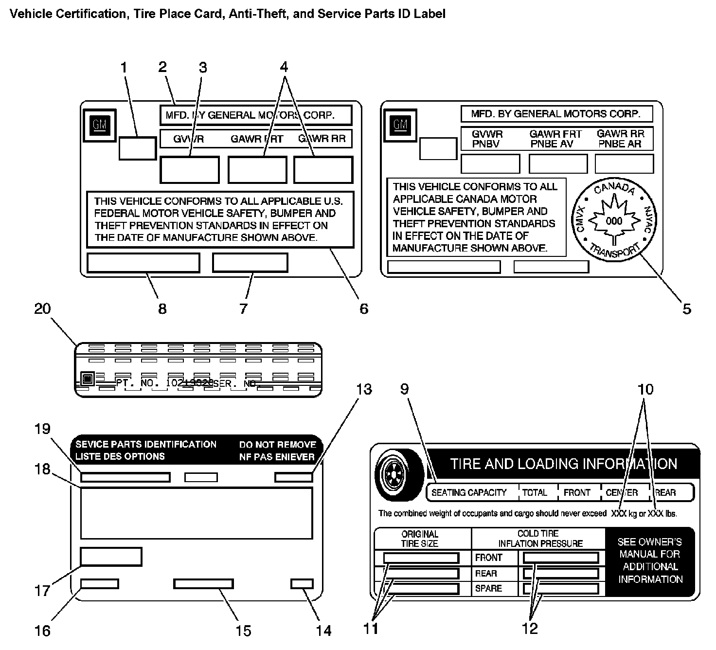 Vehicle Certification, Tire Placard, Anti-Theft, and Service Parts ID Label