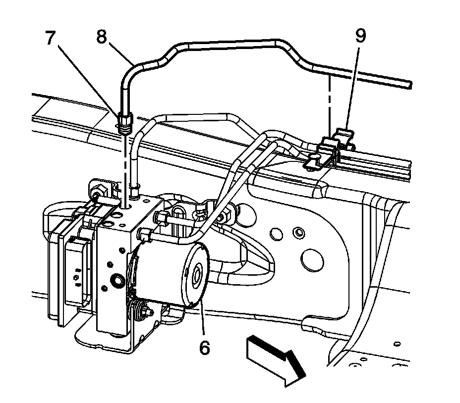 8. Remove the front brake pipe (8) from the BPMV (6) and the retaining clip (9).