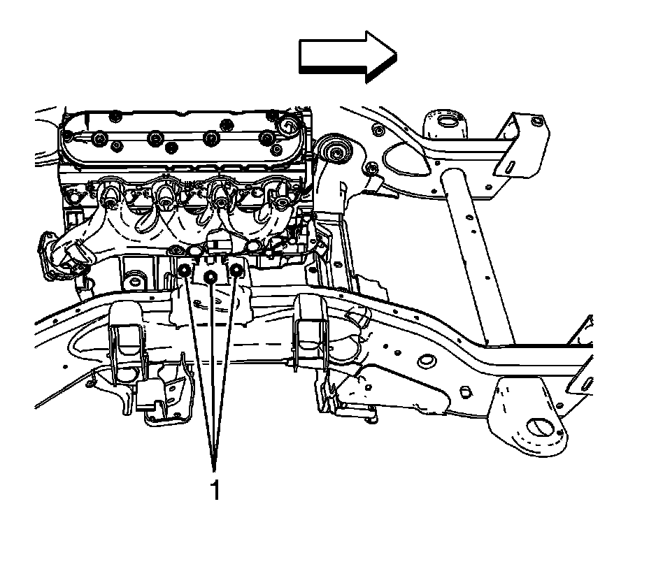 8. Working through the wheelhouse opening, remove the engine mount to engine bolts (1).