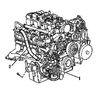 2. Remove the discharge hose mounting bolt (2) from the A/C compressor.