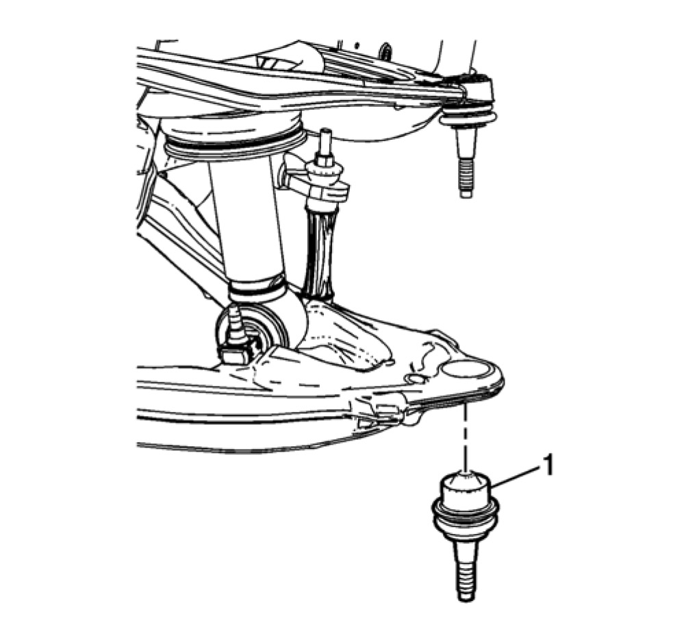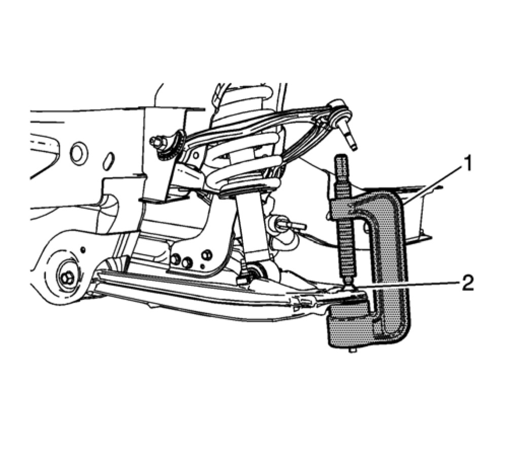 6. Using the J-41805 kit (1) and a shallow socket, remove the lower ball joint (2) from the control arm.