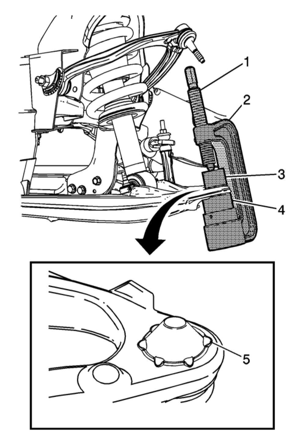 4. Using the J-41805 kit (2), CH-49240-3 (1), CH-49240-1 (4) and the CH-49240-2 (2), collapse the edge of the ball joint to create the lock tabs (5). Tighten the CH-49240-3 to 250 Nm (184 lb ft).