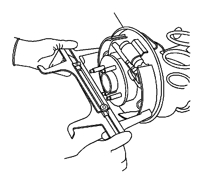 10. While holding the J 21177-A in position, insert a 0.635 mm (0.025 in) feeler gage between one side of the J 21177-A , and the corresponding brake shoe lining.